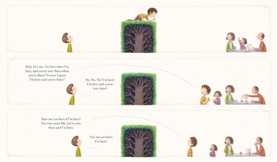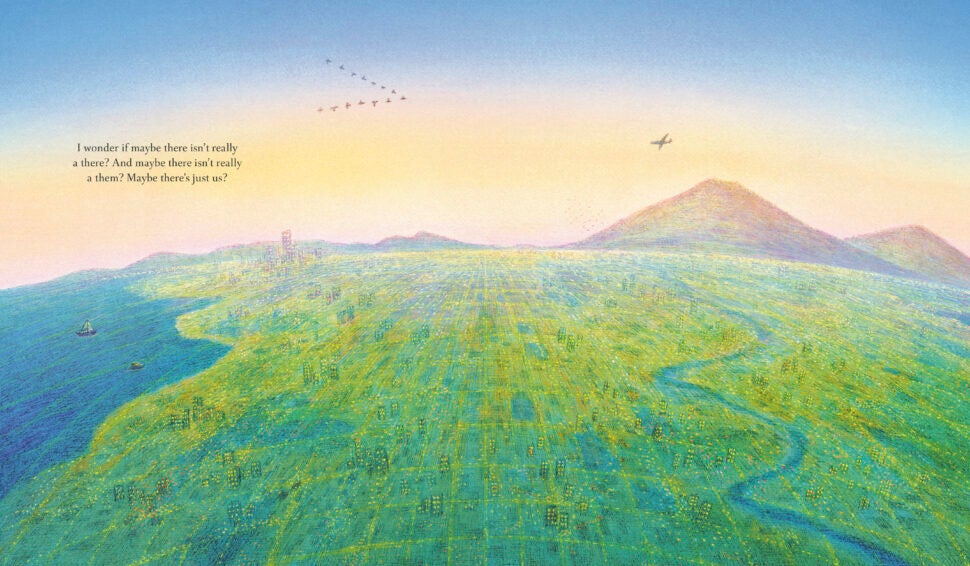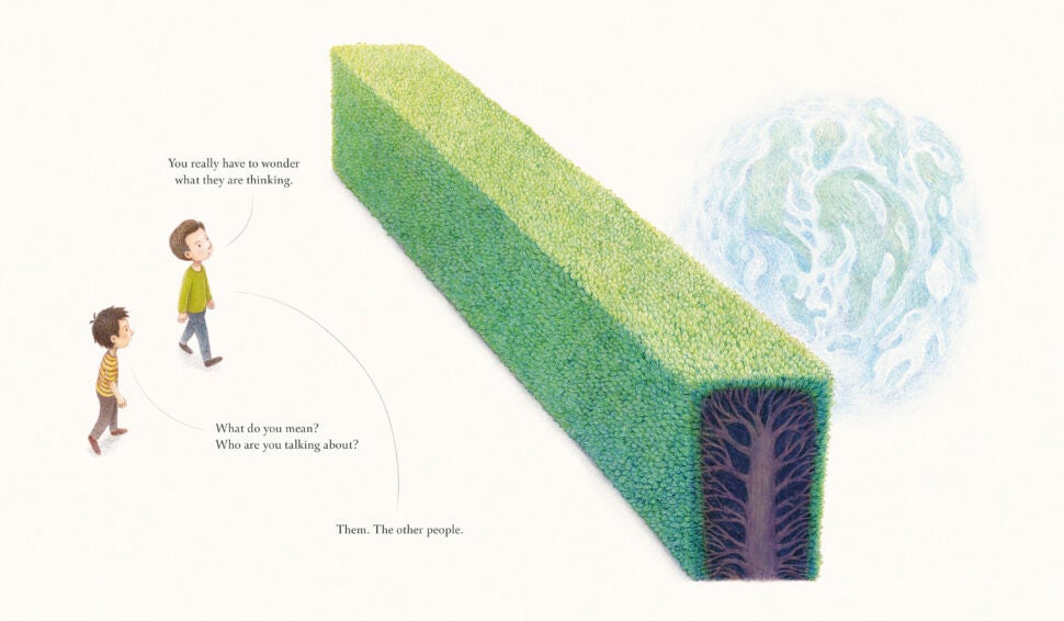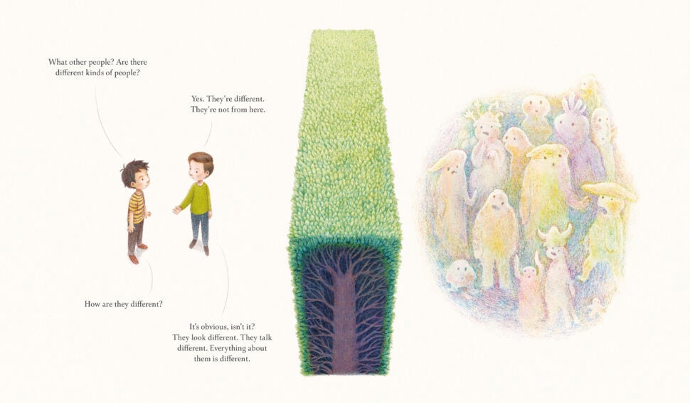 Standing by the hedge that divides them, two children wonder what the people on the opposite side are like. They’re not like us, one child insists. The other child wonders: How are they different? Can they fly? Do they have tentacles? Are they machines? Or are they human? And if they are, do they think and feel? Maybe, just maybe, the people here and the people there are not so different after all.